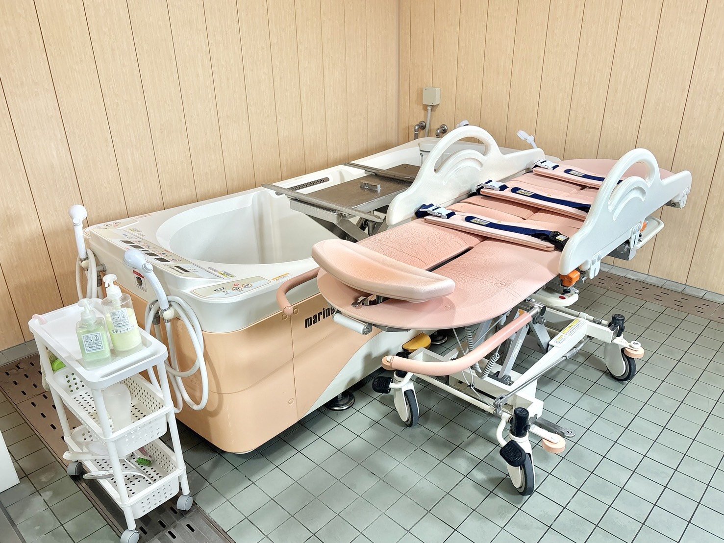 寝た姿勢のまま⼊浴できる特殊な浴槽を設置するため、ストレッチャーや⾞椅⼦の⽅でも、しっかり肩までお⾵呂に浸かって温まれます。⼊浴する⽅も介助者の負担も最⼩限のため、快適な⼊浴をお楽しみいただけます。